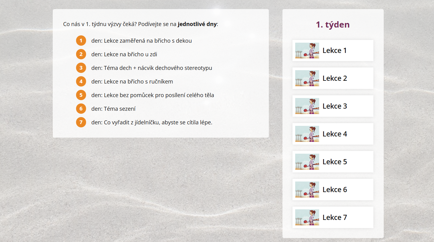 Každý týden získáte přístup ke 4 lekcím cvičení - 2 jsou kratší a 2 delší. Vždy 2 lekce jsou zaměřené více na břicho a 2 na komplexní zapojení celého těla.