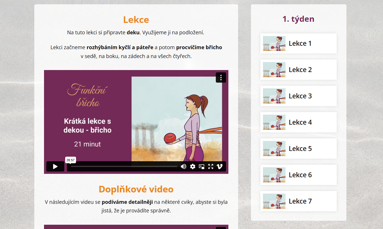 - Doplňkové video ke každé lekciPodrobněji vám vysvětlím některé cviky, abyste je prováděla opravdu správně. Upozorním vás na časté chyby a ukážu vám možné snadnější varianty.